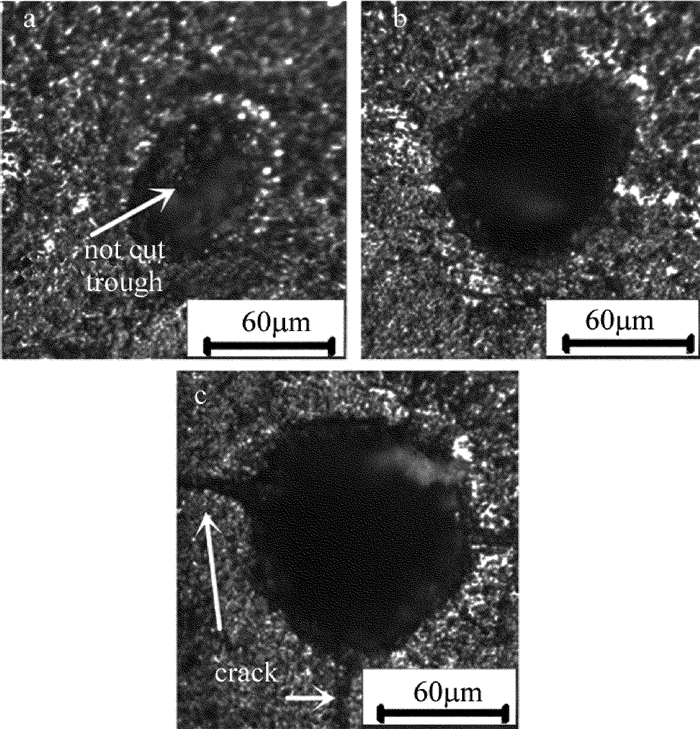 為了獲得聚晶立方氮化硼(PCBN)的激光切割質量和切割效率,依據燒蝕直徑和入射激光脈沖能量的函數關系,得出PCBN燒蝕閾值為1.796J/cm2。采用Nd:YAG激光器對型號為BN250的PCBN進行切割試驗,分析了切割速率、激光功率以及脈沖頻率對切割質量的影響規律。通過切縫的顯微觀測對比,總結出不同激光工藝參量下PCBN縫寬的變化趨勢。